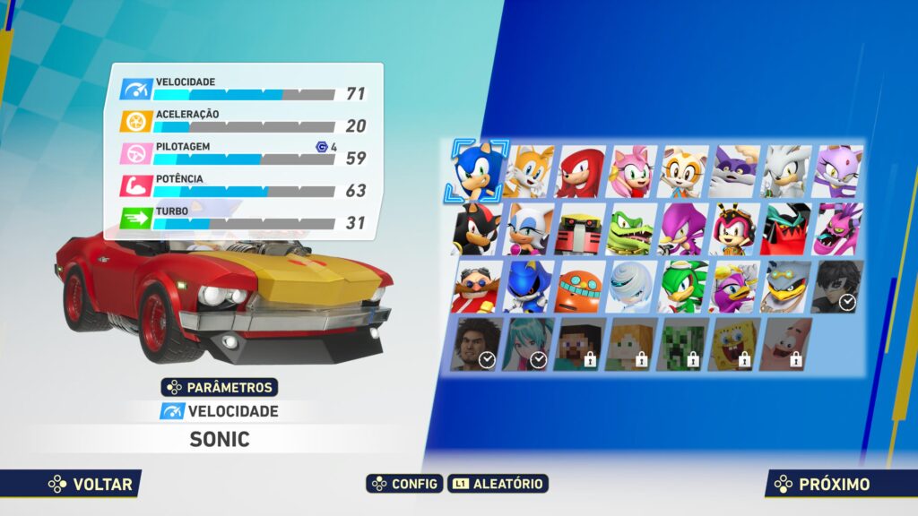 O detalhe interessante é que essa divisão não se limita apenas aos personagens. Os carros também seguem categorias similares (velocidade, aceleração, turbo e potência), permitindo que o jogador faça combinações. É possível, por exemplo, colocar Sonic em um veículo de controle, tradicionalmente ligado ao Tails, ou fazer o inverso. Essa liberdade cria um sistema de mixagem entre personagem e carro que dá um sabor único às partidas.