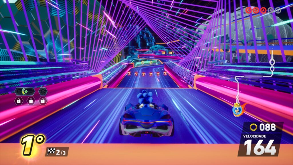No modo de campeonato, a estrutura segue o esperado, mas com algumas particularidades que dão identidade ao título. Desde o início, o jogador escolhe entre diferentes velocidades, sendo a mais rápida a chamada “Sonic”. Para liberar todos os campeonatos, é necessário concluir as provas nessa velocidade, o que já garante um nível de desafio considerável. É importante frisar que Sonic Racing CrossWorlds não é um jogo fácil! Ainda existe uma velocidade acima da mencionada (Super Sonic), assim como um modo de pista espelhado a ser desbloqueado.