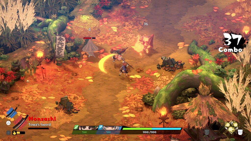 A jogabilidade de Towa and the Guardians of the Sacred Tree se destaca por seu sistema de controle duplo. Em cada incursão, você escolhe dois guardiões: o Tsurugi, focado em combate corpo a corpo, e o Kagura, especializado em magias de suporte.