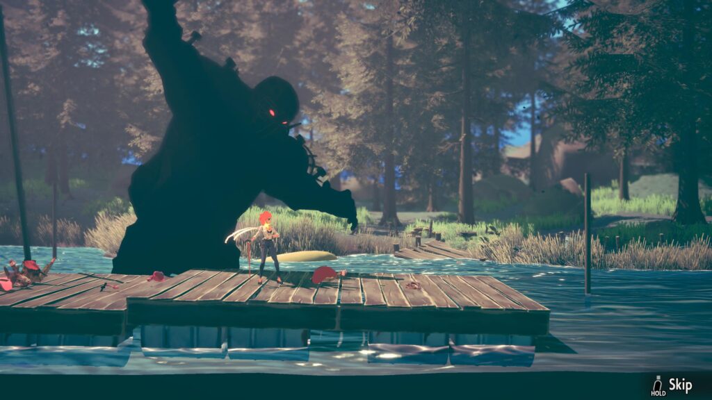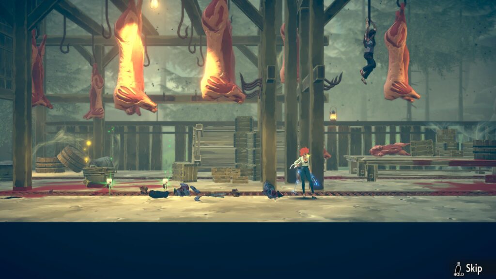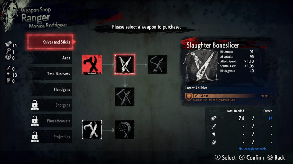 A cada tentativa, o jogador coleta recursos como dinheiro e dentes, que são usados para desbloquear melhorias permanentes. É possível adquirir novas habilidades para Justine e expandir seu arsenal com armas de curto e longo alcance. O design do armamento se destaca pela originalidade, fugindo do tradicional com itens como serras, machados e até combinações inusitadas, como uma faca empunhada junto a uma muleta quebrada.