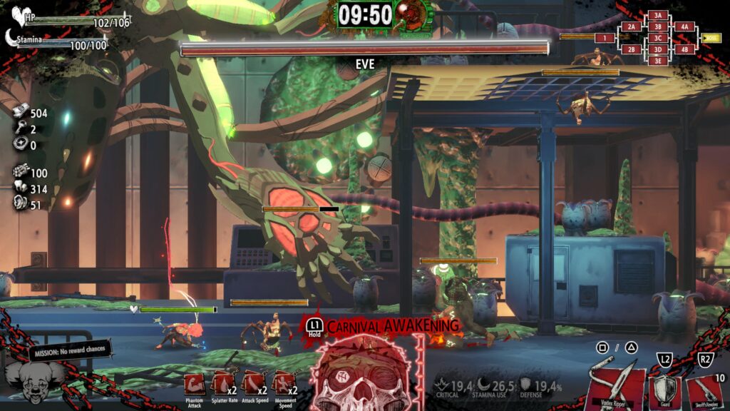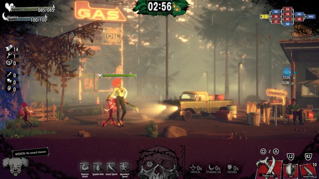 As batalhas contra os chefes são visualmente criativas e bizarras, mas é nelas que as falhas de jogabilidade se tornam mais evidentes. Além do atraso nos comandos, surgem problemas de detecção de colisão, como um ataque frontal do inimigo atingir o jogador que está em suas costas.Para contrabalancear os desafios, o jogo introduz uma mecânica original e positiva: os “slasher phantoms”. São fantasmas de suas tentativas anteriores que lutam ao seu lado, replicando os movimentos que você fez. É uma forma inteligente de fazer com que seu “eu” do passado ajude a superar os obstáculos do presente.