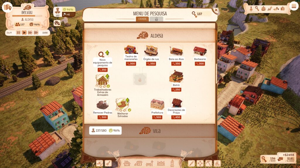 O gerenciamento também envolve pontos de pesquisa, que funcionam como a principal moeda de evolução. Eles permitem desbloquear novas construções, melhorias de ruas, decorações e até recursos mais complexos de administração, como impostos e políticas públicas. Isso cria uma sensação clara de progressão: uma vila pequena com 50 habitantes não exige o mesmo cuidado que uma cidade com centenas de moradores, e Town to City reflete isso muito bem.