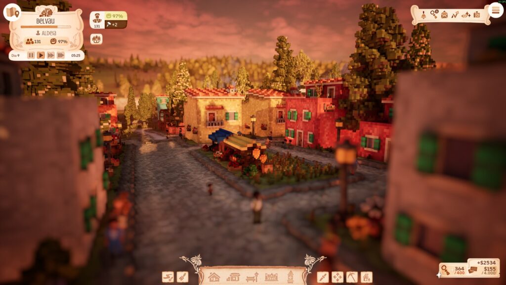 O jogo utiliza Ray Tracing via Lumen, o que garante um impacto visual impressionante. Reflexos em lagos, a iluminação dinâmica do pôr do sol e as luzes da cidade ganhando vida à noite criam um cenário de tirar o fôlego. Mesmo sem apostar no hiper-realismo, o estilo voxel art aliado às tecnologias modernas faz com que Town to City seja visualmente único.