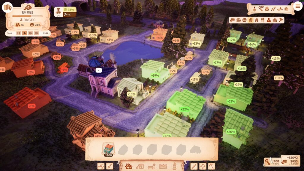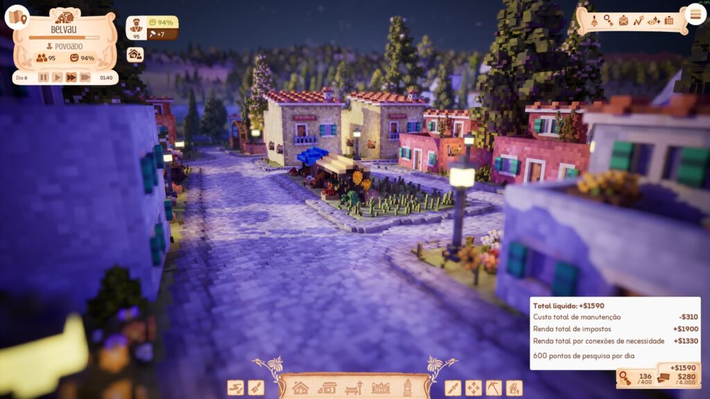 Ver a cidade iluminada à noite, com todos os detalhes escolhidos pelo jogador, é recompensador. Esse aspecto reforça o caráter de cozy game, oferecendo uma experiência relaxante que vai além do simples gerenciamento de recursos.