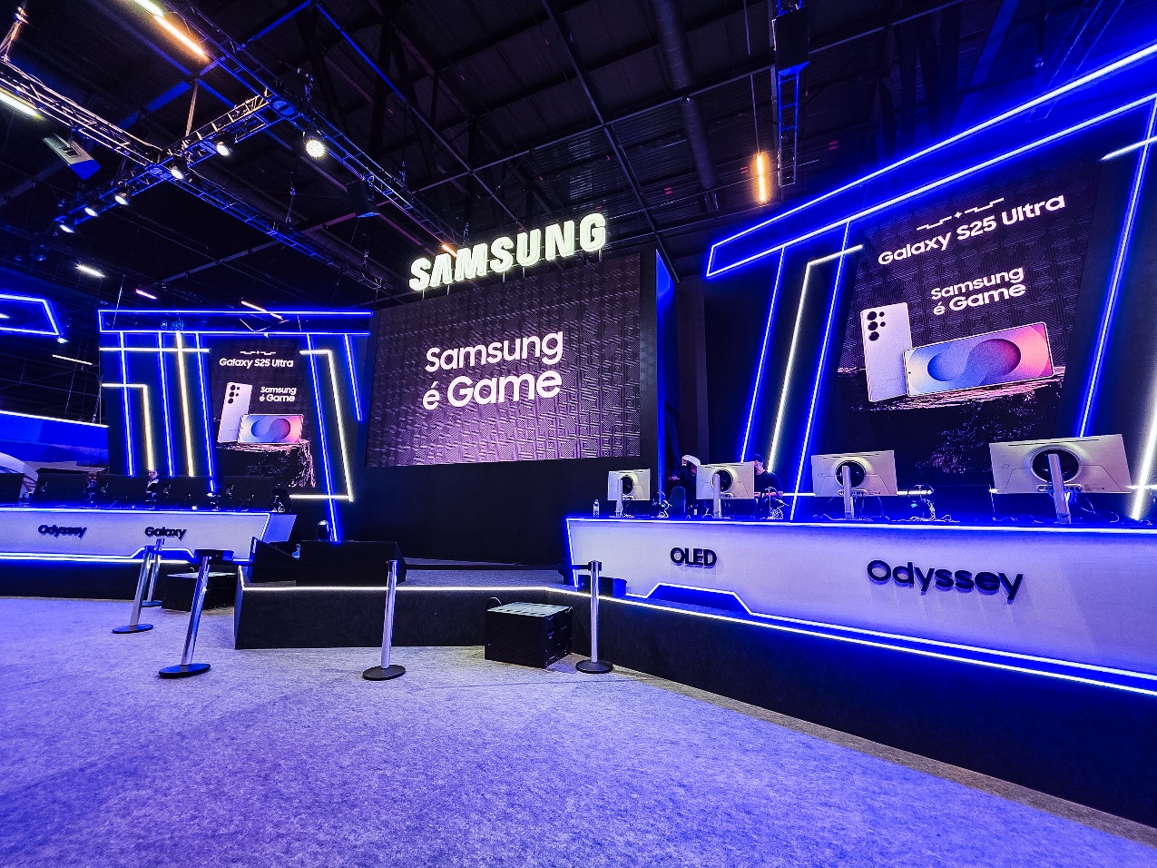 Os visitantes podem explorar a linha de monitores Odyssey, com destaque para o Odyssey OLED G6 500Hz e o Odyssey 3D, além de estações dedicadas a monitores como o Odyssey Neo G9 e o Odyssey OLED G9. Há também a possibilidade de testar o Odyssey G5, que oferece resolução QHD e taxa de atualização de 165 Hz.