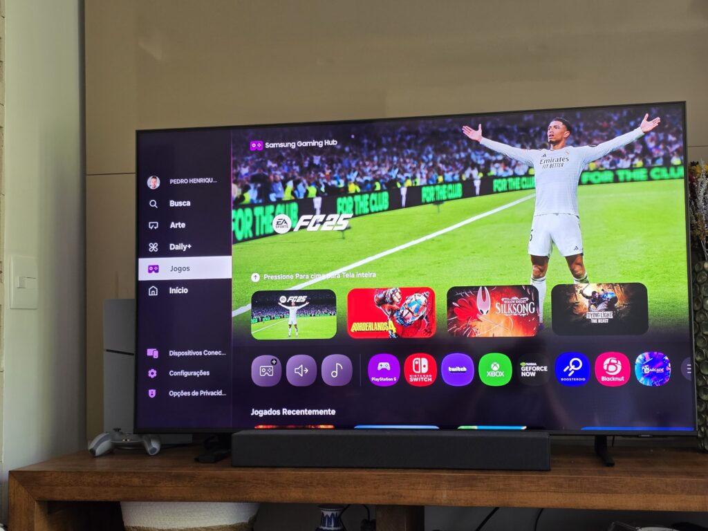 O Tizen é aquele que já conhecemos, e com promessa de 7 anos de atualizações pela Samsung (uau para TVs no Brasil). Os hubs principais são claros, com uma aba de início para os apps, o Gaming Hub concentrando streaming de jogos e entradas de console/PC, a seção Daily+ para recursos de casa conectada e utilitários, e o modo Arte para quando a TV vira parte da decoração. A Integração com SmartThings está no DNA da TV e, nesta geração, ela própria funciona como hub com suporte a Zigbee e Thread, o que é um ganho se você já tem lâmpadas, trancas e sensores espalhados pela casa.