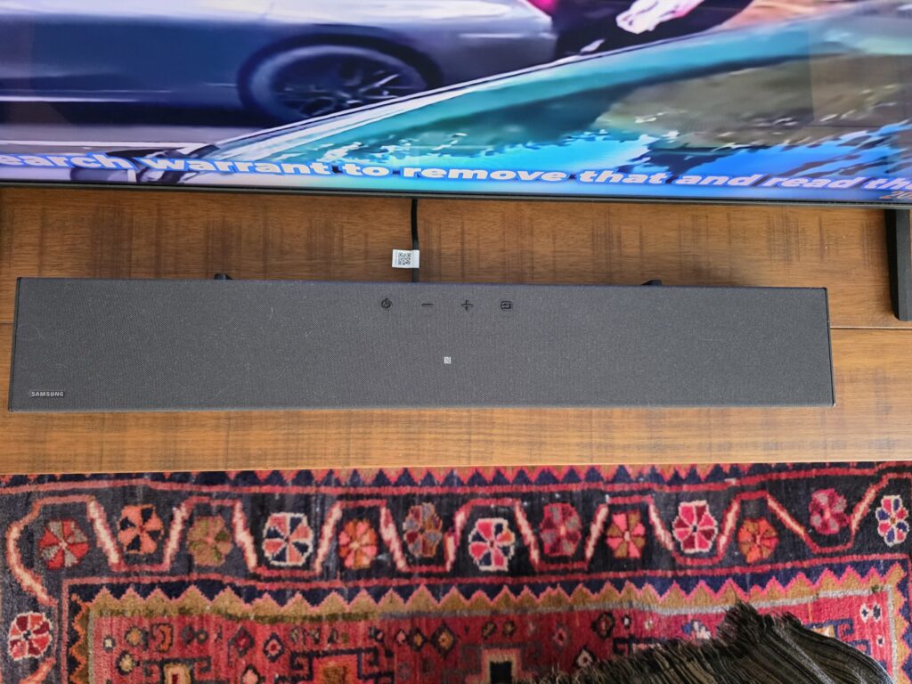 Falando em Q-Symphony, a Samsung enviou em conjunto a soundbar B400F*, que além de não ter suporte ao Q-Symphony, parece essas soundbars focadas em PC, para colocar na mesa, abaixo do monitor. Ela é competente para este segmento de entrada, mas por 760 reais, ou você pega uma soundbar simples de PC por muito menos, ou coloca mais 300 reais e começa a ter acesso a soundbars com sistema 2.1 com subwoofer da própria Samsung.
