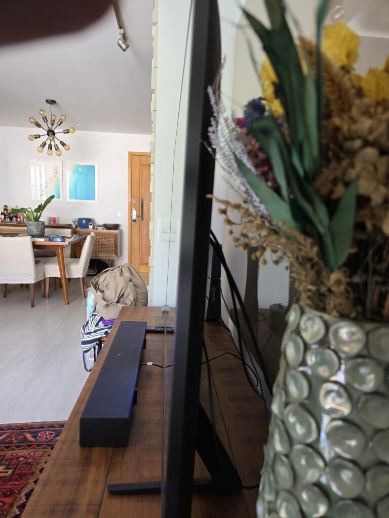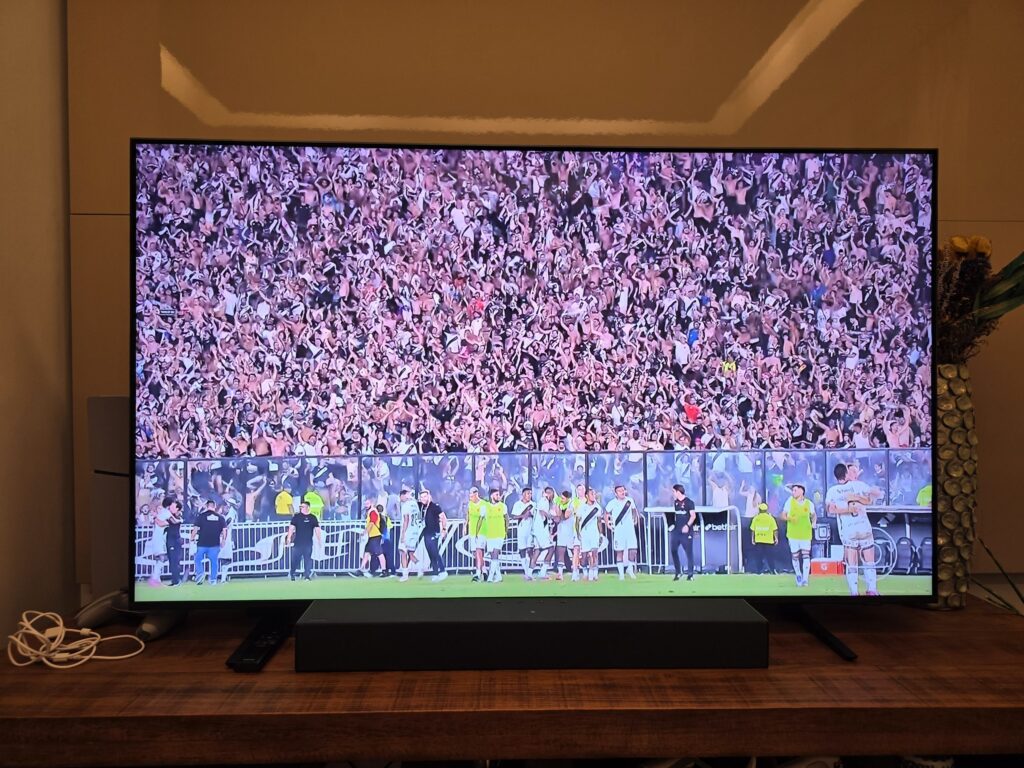 Há, claro, limites. A Samsung não divulga o pico real de brilho sustentado nem a quantidade de zonas de escurecimento para o tamanho de 55 polegadas. Esses dois fatores definem o teto do impacto em cenas extremas, como pontos de luz muito intensos flutuando em fundo preto absoluto. E, por ser um LCD com local dimming, o blooming ainda pode aparecer nesses cenários difíceis para uma TV não-OLED.