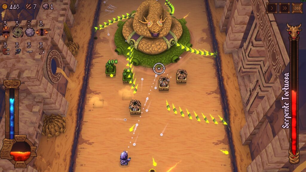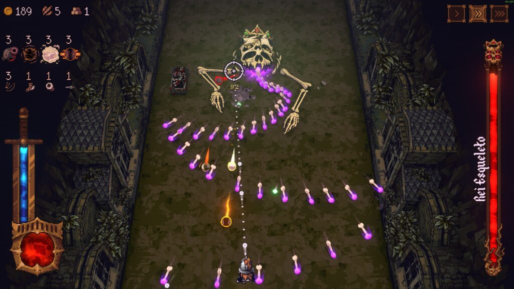 A segunda parte de Ball x Pit é onde o jogo realmente mostra seu diferencial. O gameplay combina mecânicas de Arkanoid, roguelite e shoot’em up, criando um ritmo dinâmico e ao mesmo tempo estratégico.