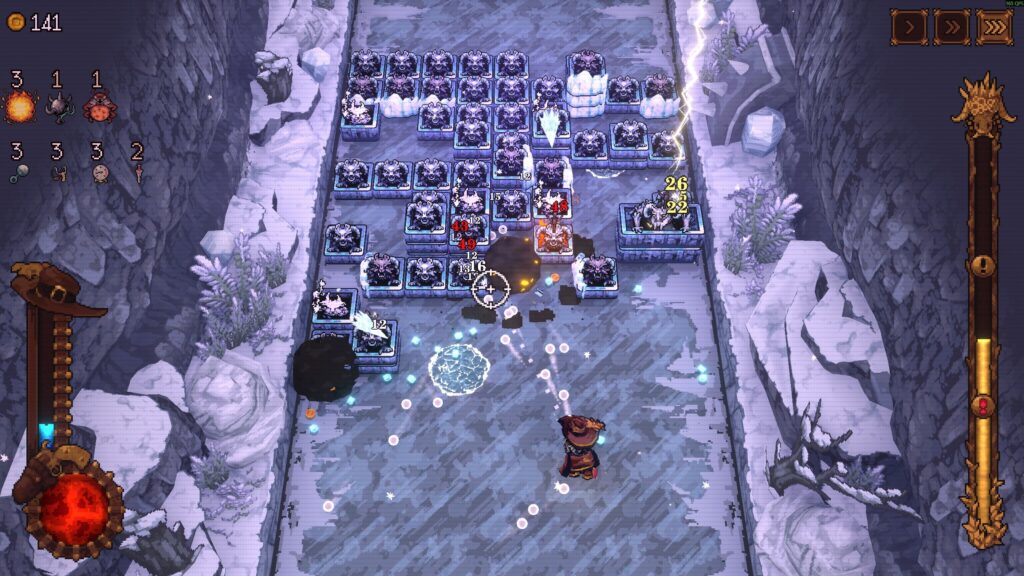 Durante as incursões, o jogador adquire novos poderes e combinações, podendo fundir ou evoluir habilidades, o que cria um sistema de progressão viciante. Os ataques inimigos evoluem de simples projéteis a verdadeiros padrões de “bullet hell”, exigindo precisão e reflexos.