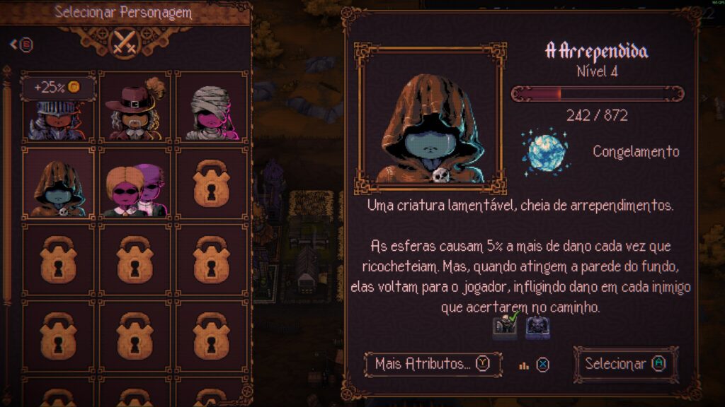 O sistema de progressão também é um destaque: evoluir a vila, aprimorar os personagens e sentir essa melhora refletir diretamente nas runs é algo realmente satisfatório. É interessante perceber como, com o tempo, os chefes que antes pareciam um grande desafio passam a ser superados com facilidade, mostrando o quanto Ball x Pit recompensa o jogador por sua persistência.