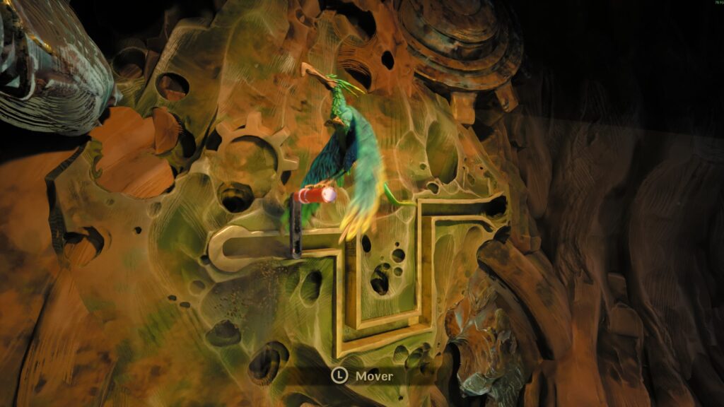 O pássaro é essencial em alguns puzzles ambientais, seja fazendo peso em plataformas, acionando manivelas ou interagindo com mecanismos que exigem movimentação sincronizada entre o jogador e o aliado. Essas seções ajudam a dar um respiro à exploração, mesmo que as soluções sejam sempre bastante óbvias.