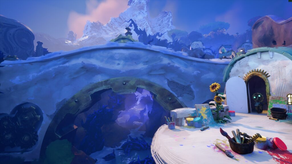 Há também algumas mecânicas únicas em momentos específicos da campanha, como a habilidade de pular e planar em uma das áreas mais coloridas, ou a possibilidade de avançar e retroceder o tempo em outra cidade. São ideias interessantes que quebram a monotonia e mostram a criatividade da Double Fine em buscar novas formas de expressar a temática do jogo.