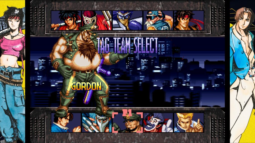 Jogar Kizuna Encounter hoje, como primeira experiência, é bem interessante. A jogabilidade é intuitiva no básico, mas esconde uma dificuldade desafiadora, especialmente em relação a alguns personagens que parecem desequilibrados. O jogo exige reflexos e timing, mais do que combos complexos, o que o torna viciante à sua própria maneira. Além disso, como o você só pode trocar de personagem se estiver do seu lado da tela, tudo fica ainda mais estratégico e um posicionamento ruim pode acabar rapidamente com qualquer round! É o puro suco da SNK dos anos 90 que a gente não conhecia: exagerado, mas cheio de vida, com sprites grandes, fundos 2D sombrios e animações de introdução que parecem tiradas de um filme de ação trash da época.