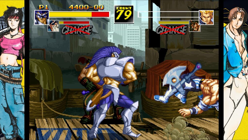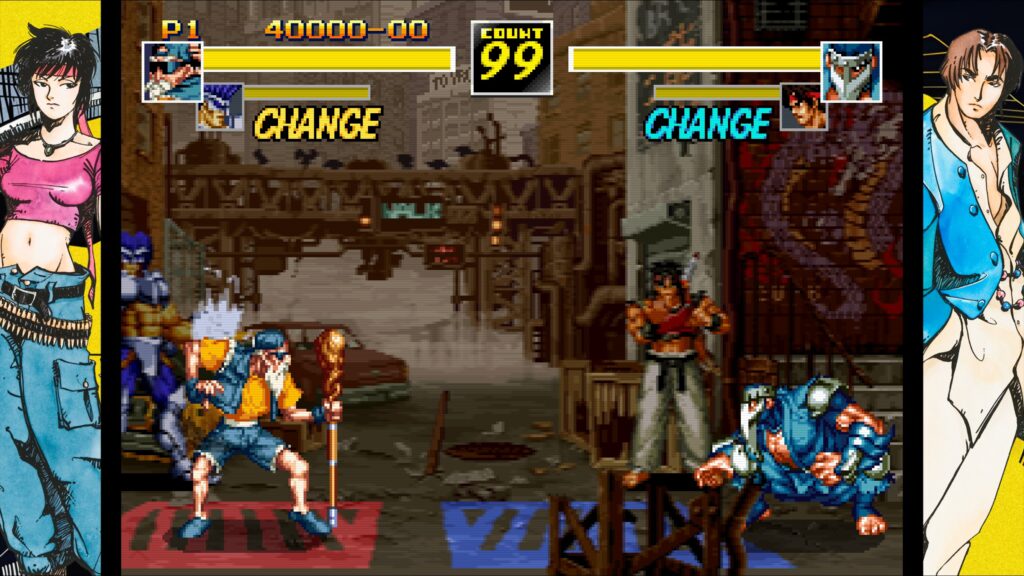 O que torna esse retorno notável é a persistência da SNK em manter vivo seu legado, nos dando a chance de conhecer títulos que nunca cruzaram nosso caminho. Em uma época dominada pelos polígonos de Tekken e Virtua Fighter, a SNK e a Capcom mantinham a arte 2D acesa, com um pixel art que até hoje impressiona. Kizuna Encounter, lançado originalmente em 1996 como sequência de Savage Reign, chegou em um mercado de jogos de luta super saturado e, honestamente, acabou sendo engolido pela concorrência feroz, ficando à sombra de gigantes como X-Men vs Street Fighter e até mesmo dos títulos da própria SNK.