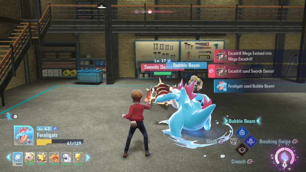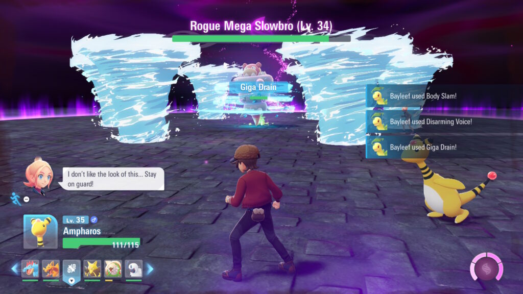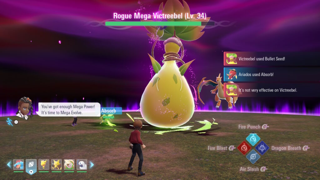 Os ataques agora operam com cooldowns, substituindo o antigo sistema de PP. O jogador pode mirar, atacar e se esquivar em tempo real, tornando cada confronto mais tático e envolvente. As batalhas contra Pokémon Alpha e Mega se destacam, exigindo atenção e reflexos rápidos, especialmente quando há múltiplos inimigos em cena. Inclusive os combate contra os Mega são combates como se fosse um grande chefe sendo algo único e mais desafiador.