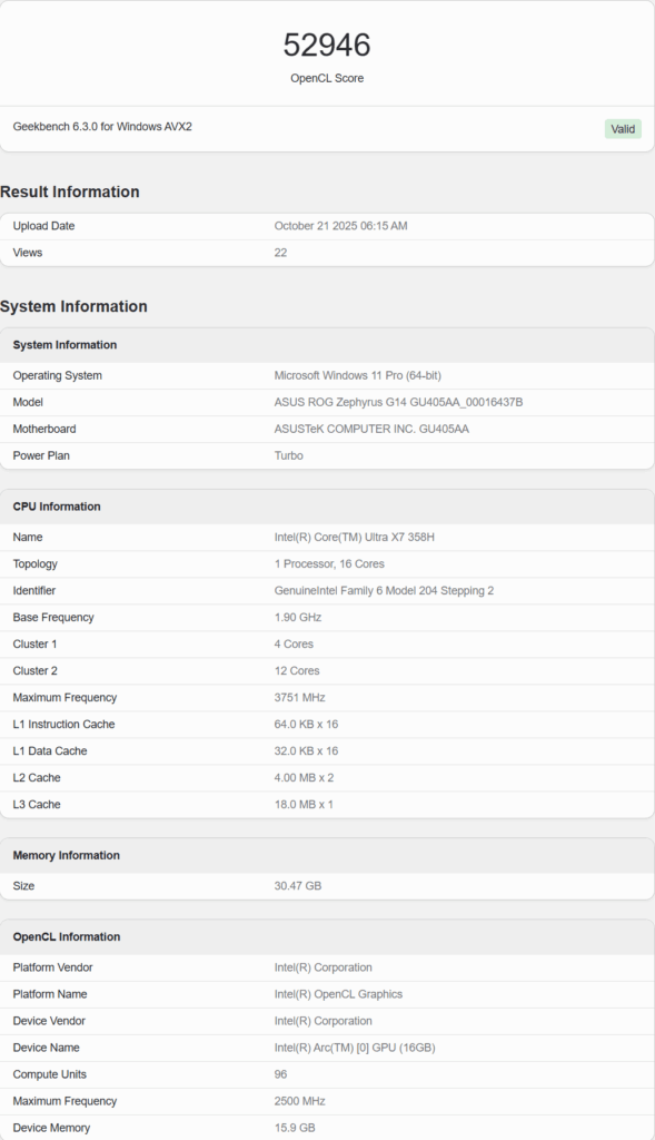 O primeiro CPU Intel Panther Lake, o Core Ultra X7 358H, vazou no Geekbench, revelando suas capacidades de desempenho com a GPU Xe3 Arc. O vazamento ocorreu através do laptop ASUS ROG Zephyrus G14, que deve ser um modelo de 14 polegadas equipado com esse novo processador da Intel.