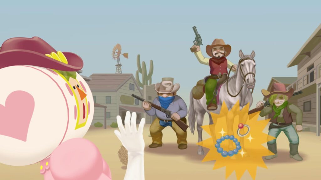 Essa fórmula clássica continua sendo o coração da experiência, mas o grande diferencial aqui está nas novas temáticas e variações das fases. Cada mundo é ambientado em uma era histórica específica, e todos os objetos disponíveis refletem aquele período. No faroeste, por exemplo, você rola botas, pistolas e fardos de feno; já na era dos piratas, bolas de canhão, ganchos, madeira para o barco e mais. Essa variedade dá uma identidade visual e temática divertida a cada fase.