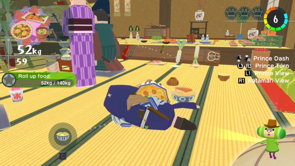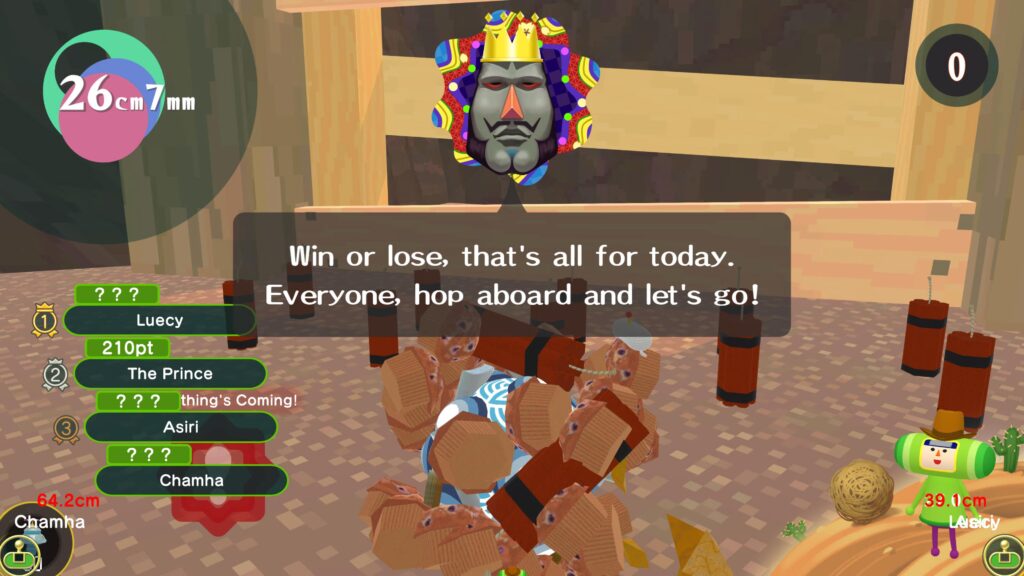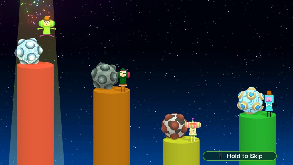 Outro destaque em Once Upon a Katamari é o modo competitivo, que funciona quase como uma versão “Katamari Party”. Nele, até quatro jogadores, o Príncipe e seus primos, competem para ver quem consegue rolar mais objetos em um tempo determinado. Durante a partida, é possível até empurrar os adversários e roubar seus itens, e a pontuação final leva em conta critérios como quem coletou mais pessoas, quem teve a maior Katamari ou quem usou mais poderes. O resultado é um modo leve e caótico, que combina bem com o tom descontraído da série.
