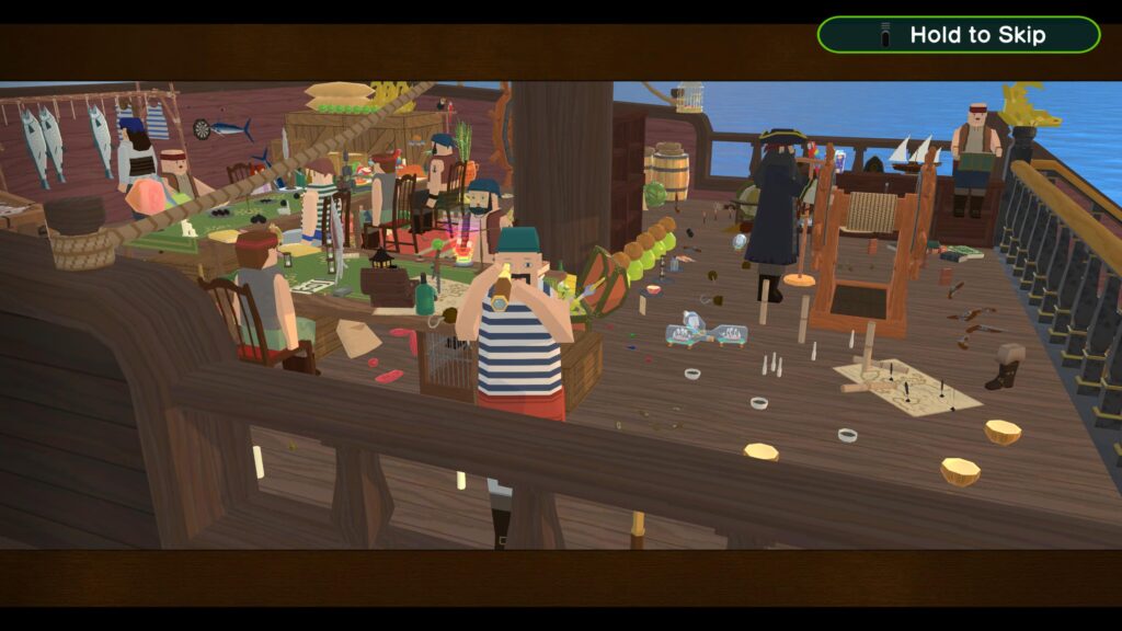 A ambientação ganha vida principalmente através das animações curtas e eventos dentro das fases. Em alguns momentos, o jogo insere pequenas transições que mostram o crescimento da sua Katamari (como o tradicional passar de um quarto pequeno para um campo aberto) ou cenas cômicas que reforçam o absurdo da situação. Um exemplo é a fase dos piratas, onde tudo começa em um navio silencioso e entediado, até que uma batalha contra outro navio inimigo transforma o cenário em um caos divertido com ainda mais objetos para rolar.