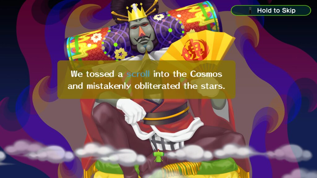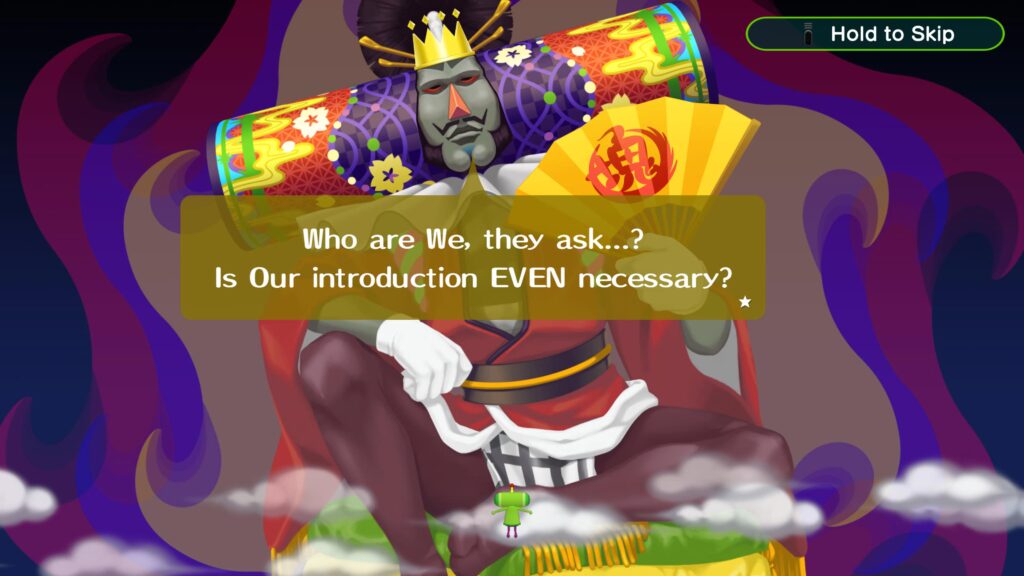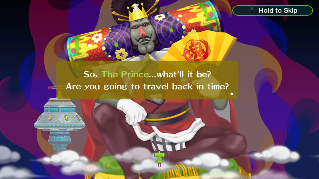 Entre uma fase e outra, o jogo apresenta pequenas vinhetas animadas que mostram as trapalhadas do Rei e da Rainha dos Cosmos — desde visitas a apresentações de kabuki no Japão antigo até cenas de um simples passeio onde tudo dá errado. Mesmo sem grandes avanços técnicos nessas animações, elas ajudam a dar ritmo e personalidade à narrativa, reforçando o tom cômico que é marca registrada de Katamari.