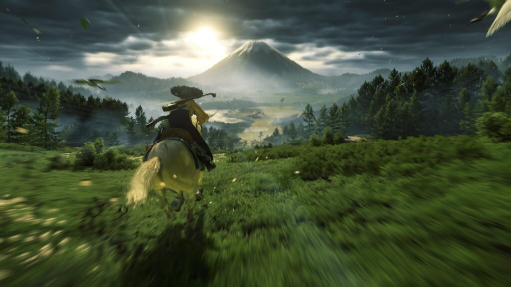 O mundo aberto de Ghost of Yotei é impressionante por sua vastidão, tornando a montaria essencial para a locomoção. Cavalgar por Ezo é uma das experiências visuais mais recompensadoras do jogo, com paisagens deslumbrantes que parecem saídas do cinema. A exploração, assim como em Tsushima, é guiada de forma orgânica: o jogo dispensa minimapas e bússolas, usando o vento para guiar o jogador até o objetivo. As missões também surgem naturalmente, com NPCs chamando por Atsu, evitando a poluição visual de ícones no mapa.