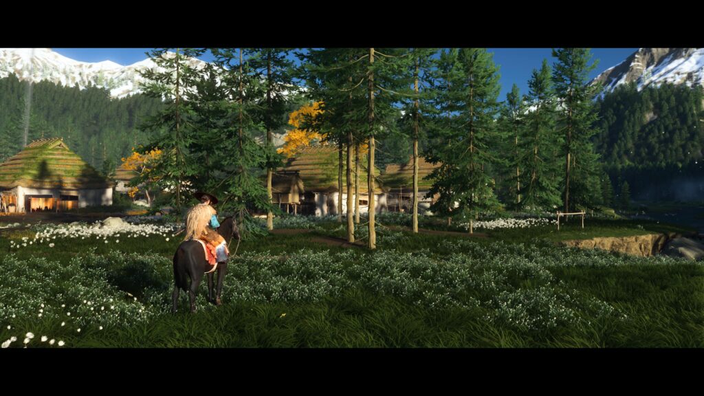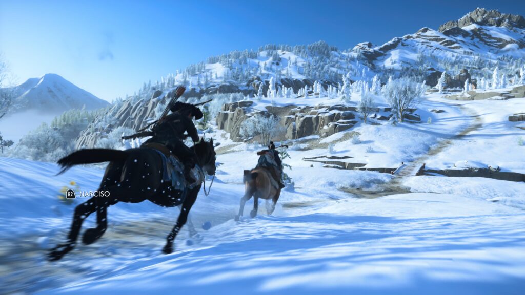 Visualmente, Ghost of Yotei está entre os títulos mais bonitos desta geração. O mundo aberto é uma sucessão de paisagens deslumbrantes, de florestas densas a picos congelados, onde cada cena parece meticulosamente composta como uma pintura. O design dos personagens acompanha esse primor, com detalhes singulares em seus trajes, penteados e feições.