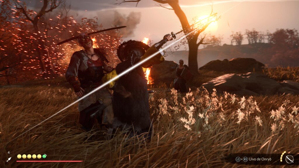 Um dos pilares do design do jogo é seu sistema de progressão, que abandona o ganho de nível por experiência. O fortalecimento de Atsu está diretamente atrelado à exploração: é preciso encontrar santuários para ganhar pontos de habilidade, termas para aumentar a vida máxima, desafios de bambu para ampliar os pontos de “espírito” e missões secundárias para desbloquear novas armas. Em suma, o jogo exige que o jogador se aventure e interaja com o mundo para evoluir.