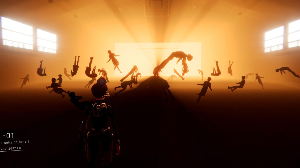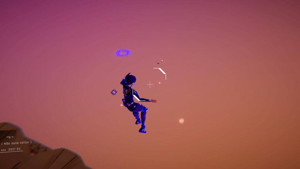Para navegar entre essas memórias, o jogo também apresenta seções de plataforma. A Observora deve saltar entre marcadores específicos para progredir. A mecânica é simples e não punitiva: errar um salto apenas reinicia a sequência, garantindo que o foco permaneça sempre na progressão da história, e não na dificuldade da execução.