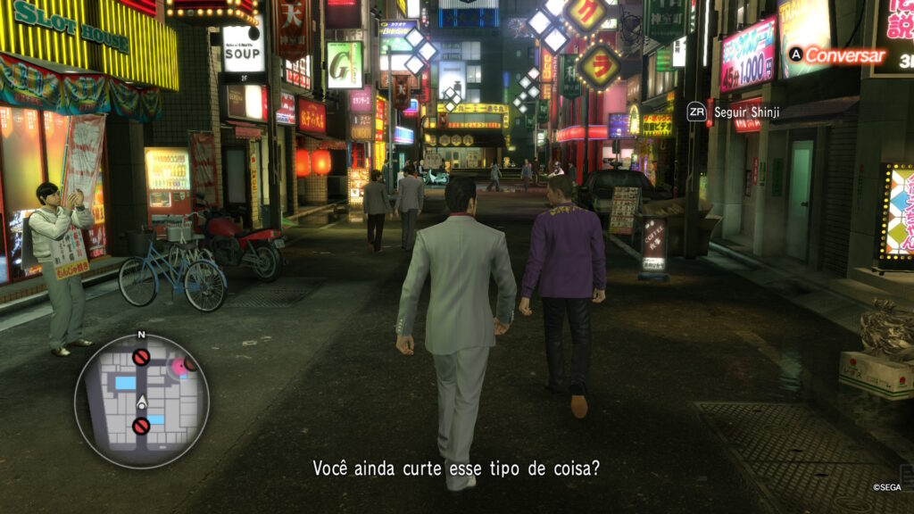 Fora da trama principal, o distrito de Kamurocho é um playground denso. O mapa está repleto de “Substories” (missões secundárias que vão do trágico ao hilário) e dezenas de horas em minigames clássicos, como karaokê, boliche, dardos, corridas de autorama e clássicos da SEGA nos fliperamas.