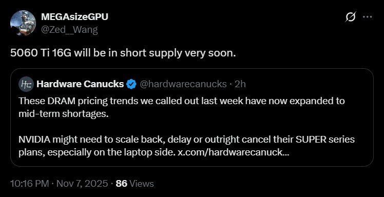 Embora essa informação não venha de fontes oficiais, o histórico do leaker sugere que podemos ver relatos mais confiáveis sobre o assunto em breve. Recentemente, foi relatado que a NVIDIA está instruindo a limitar o fornecimento das GPUs RTX 5060 Ti 8 GB devido ao fraco desempenho no mercado, incentivando a venda das edições de 16 GB. Como a GPU tem estado disponível pelo preço sugerido por um tempo e é uma das mais populares da série RTX 50, isso indica uma demanda maior.