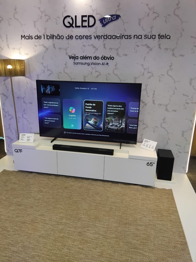 - Inteligência Artificial (IA): As TVs agora contam com o Vision AI Companion. A assistente Bixby foi atualizada para um modelo de IA generativa conversacional (LLM), e o Copilot também está integrado nativamente. Isso permite que o usuário faça perguntas contextuais sobre o que está assistindo, como “qual o nome do diretor deste filme?”.