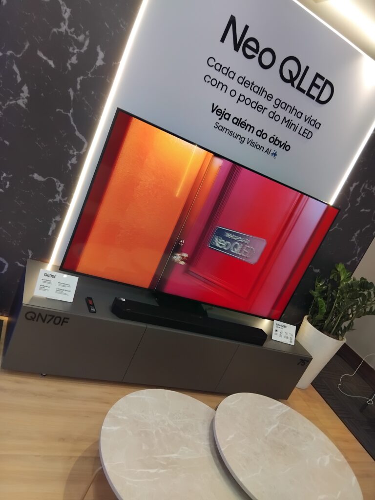 A QN70F (disponível de 55″ a 85″) é a aposta da marca para quem deseja migrar para uma tela premium sem saltar para os modelos mais caros. Ela foi posicionada estrategicamente para diminuir a lacuna de preço entre a linha QLED convencional e a Neo QLED.
