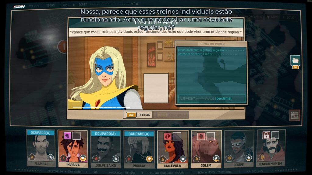 A narrativa te prende de um jeito quase imediato. Eu praticamente joguei do início ao fim querendo ver onde a trama levaria cada personagem, e esse é um mérito claro da escrita da AdHoc Studio. A história segue a linha que já comentamos na prévia: Robert, antes conhecido como Mecha-Man, perde sua armadura e acaba deslocado para um papel completamente diferente — agora, sentado atrás de um computador, guiando uma equipe experimental de “heróis”. Só que, como o jogo mesmo faz questão de reforçar, eles são tudo menos heróis. É um grupo de vilões operando sob supervisão, e isso gera algumas das melhores dinâmicas da história.