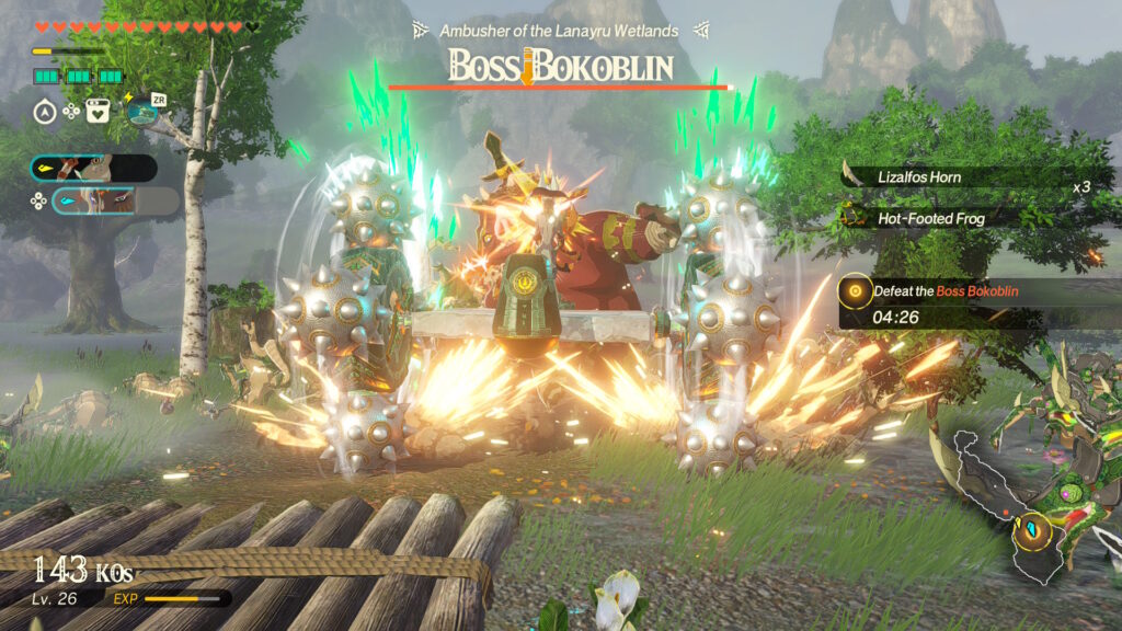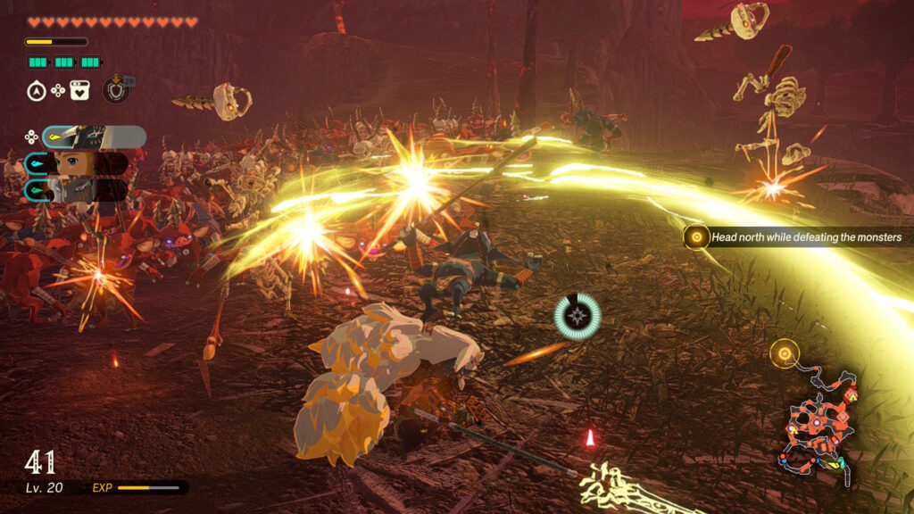A proposta narrativa funciona muito bem, especialmente porque ela se apoia nos mesmos assets e estilo visual de Tears of the Kingdom. Como resultado, o jogo mantém aquela estética em cel-shading já conhecida da franquia, e cria a sensação de que estamos realmente expandindo um pedaço da história do jogo principal, mas agora com o dinamismo característico de um musou.