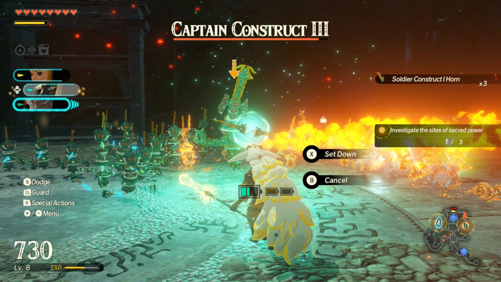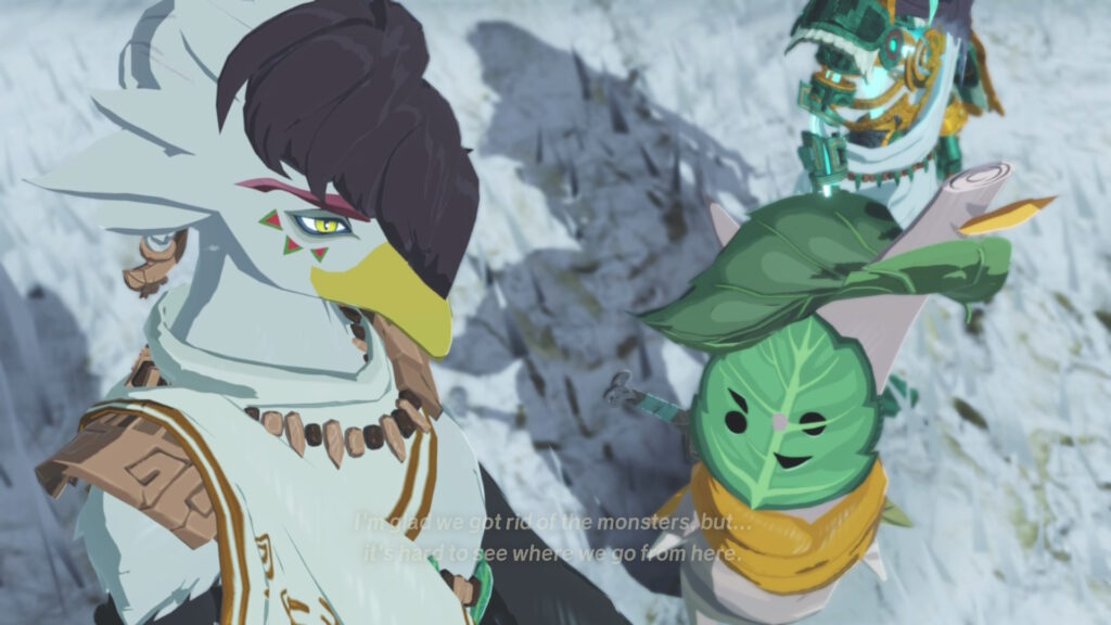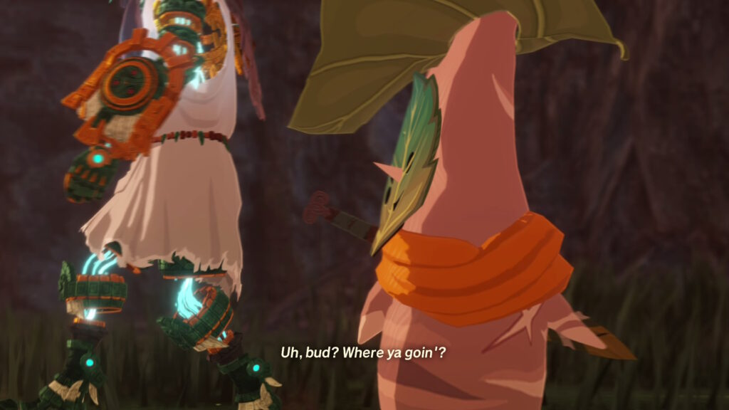 A história ainda introduz dois novos personagens que funcionam muito bem no conjunto. O primeiro é Calamo, um Korok que serve como alívio cômico, sempre dividido entre a vontade de lutar e o medo de realmente entrar em combate. Já o segundo é um Construct misterioso, um tipo de guerreiro Zonai que segue cegamente qualquer ameaça maior, funcionando quase como um “espelho” temático do Link, mas com personalidade própria.