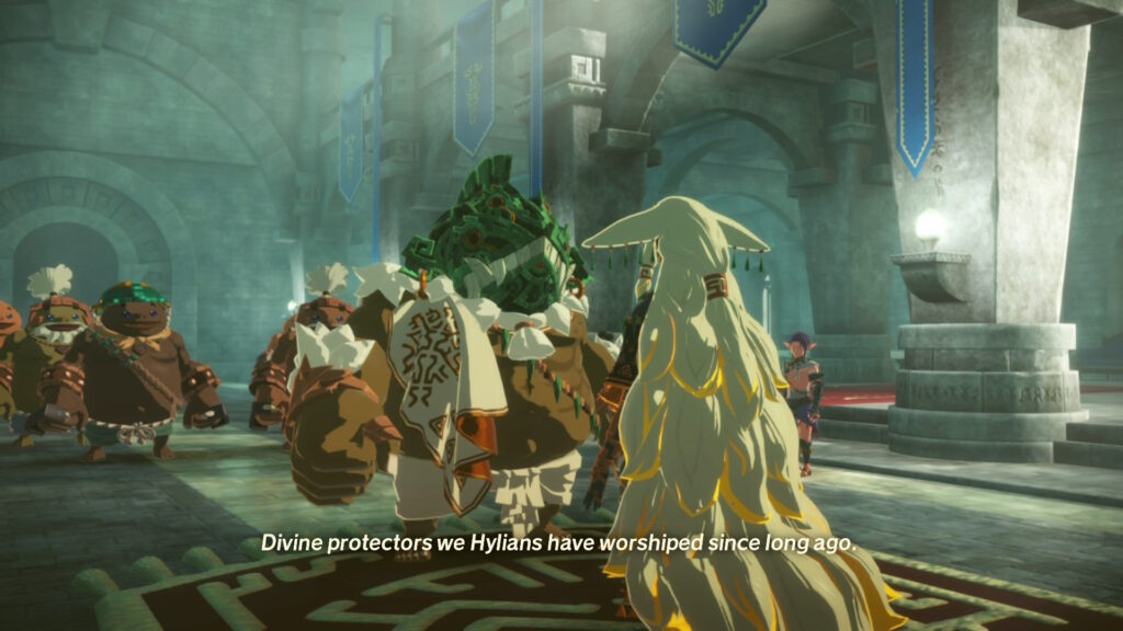Assim como no jogo original, acompanhamos a Zelda viajando ao passado, algo que acontece logo nos minutos iniciais de TOTK e que aqui se torna o ponto de partida da campanha. E ao contrário do que estamos acostumados na série Hyrule Warriors, quem assume o papel central desta vez não é o Link, mas sim a própria Zelda. Ela passa a construir laços com figuras importantes de Hyrule, incluindo os líderes Rito, Goron, Zora e outros povos.