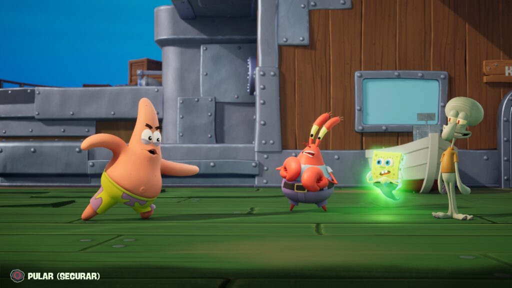 A dupla funciona como uma unidade complementar. Bob Esponja, com suas habilidades de Caratê, pode usar um ataque teleguiado e voar por curtas distâncias, além de usar sua varinha de bolhas. Patrick, por sua vez, usa sua força para levantar objetos pesados e, de forma um pouco mais bizarra, pode se enterrar no chão (sim, essa habilidade me pegou de surpresa também!). Você terá que usar as habilidades de ambos em conjunto para superar obstáculos e abrir novos caminhos, e o fato de a troca ser imediata adiciona um ritmo bacana às seções de plataforma.