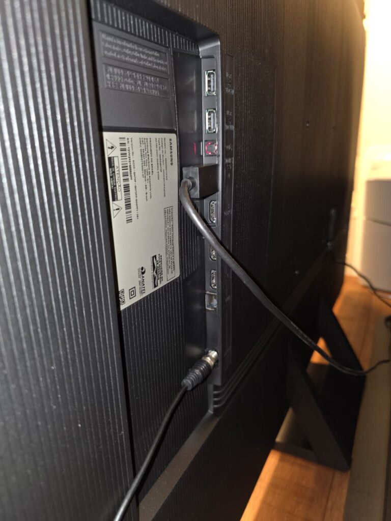 A construção é toda em plástico preto, com boa sensação de robustez. As conexões ficam agrupadas na parte de trás, viradas para o lado, o que facilita na hora de encaixar cabos mesmo com a TV próxima da parede. Nada de One Connect Box por aqui, então se você é fã da solução de caixa externa, vai ter que subir na linha Samsung.