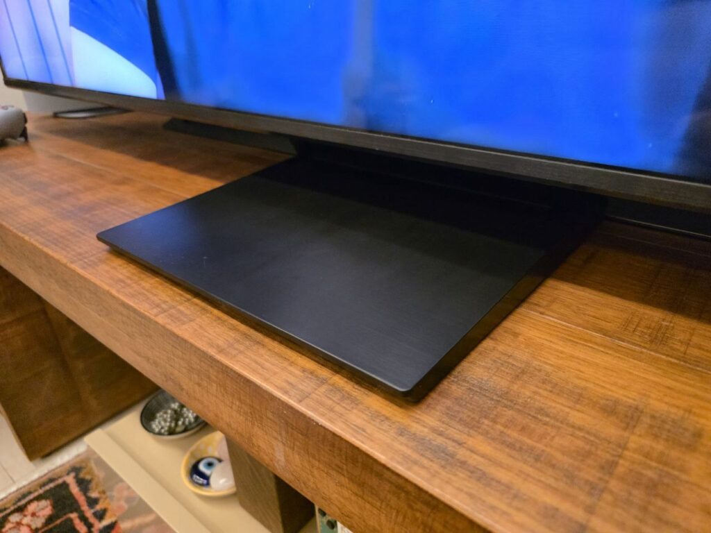 O pedestal Aero Center fica no meio da TV, é discreto e passa segurança, algo importante para quem tem rack mais estreito ou gato parkour em casa. Na versão de 55 polegadas, o conjunto passa dos 15 quilos, então ainda é uma TV grande, mas nada absurdo para um adulto manusear sozinho.