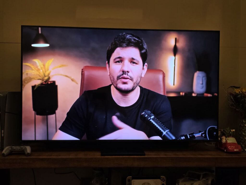 Os sacrifícios existem e precisam ser considerados. O áudio integrado é apenas ok, a tela reflexiva exige cuidado com iluminação da sala, o blooming aparece em cenas muito escuras e a ausência de Dolby Vision pode frustrar quem já investe em catálogo nesse formato. Nada disso é inesperado dentro da proposta da TV, mas faz diferença dependendo do perfil do usuário.
