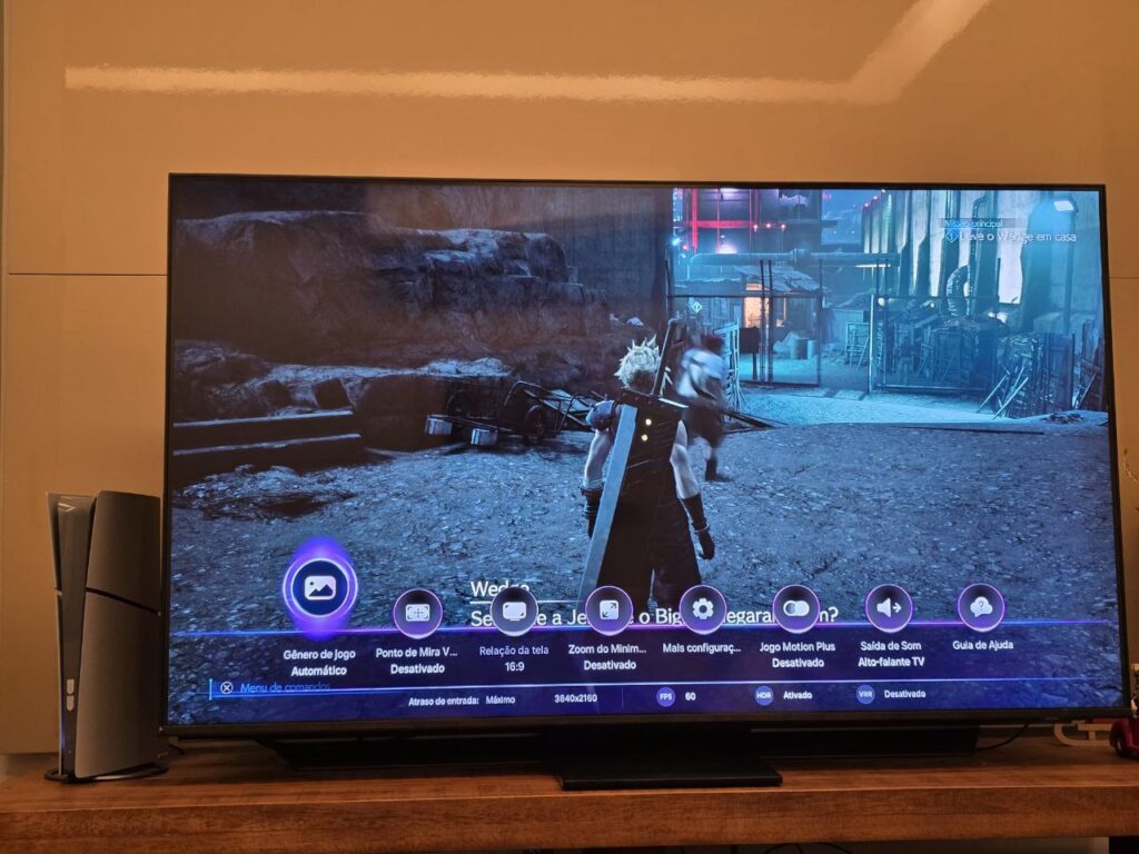 No pacote gamer, a TV ainda traz um conjunto de recursos que fazem diferença no controle e na fluidez. Há suporte a VRR com FreeSync Premium Pro, garantindo variação de quadros estável sem rasgos na imagem, além do ALLM, que coloca a QN70F automaticamente em modo jogo assim que um console é detectado. Já a conhecida Game Bar exibe informações como FPS e estado do HDR e ainda oferece atalhos rápidos para ajustes úteis, como equalizador de sombras, zoom de minimapa e os modos ultrawide em 21:9 e 32:9 para quem joga no PC.
