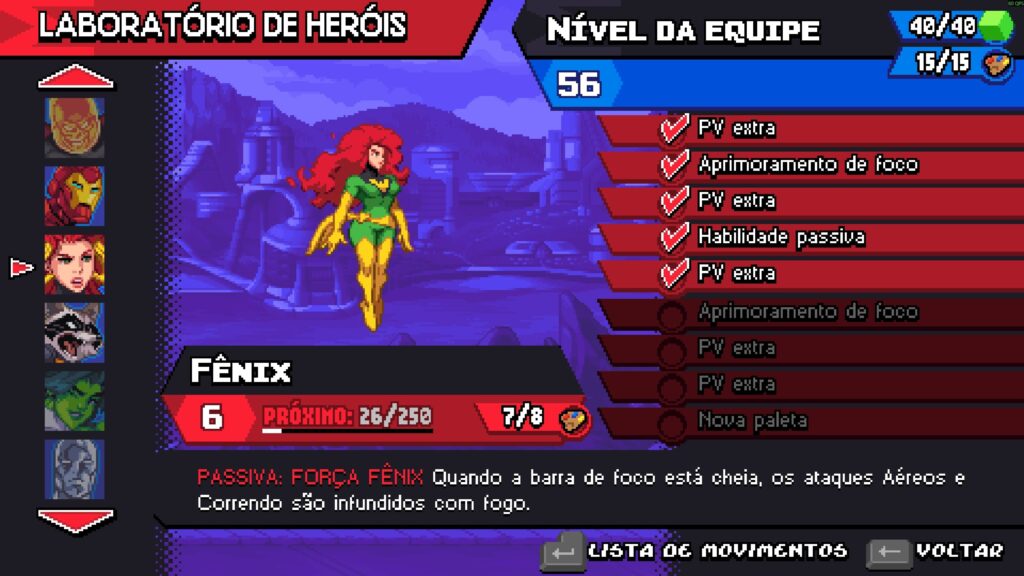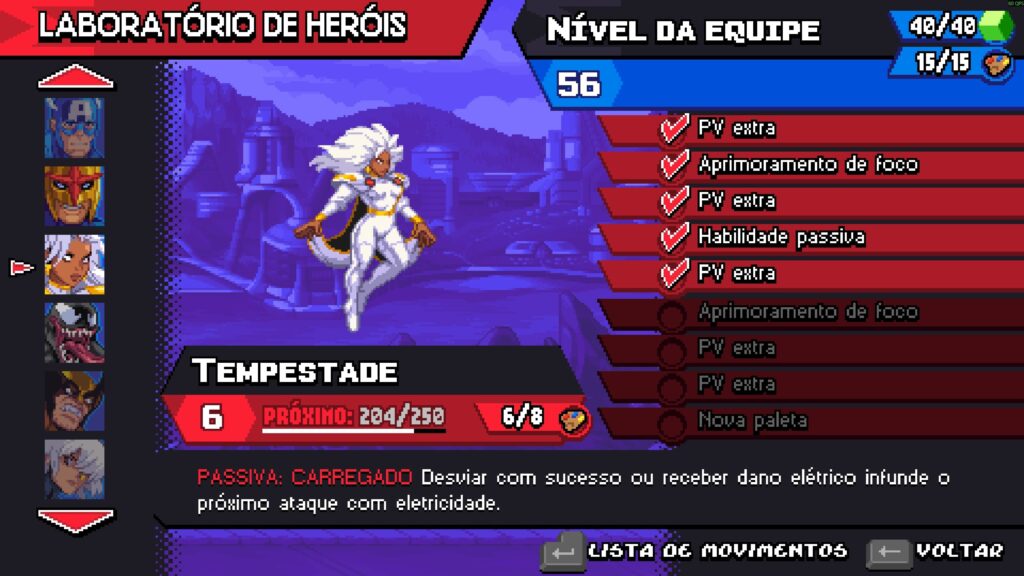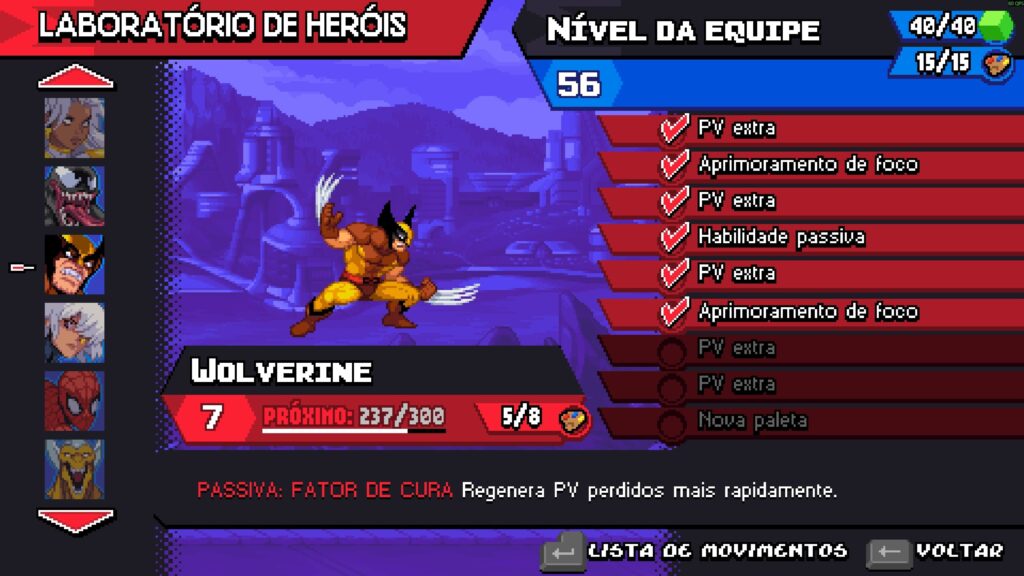 E essa variedade não é pouca. Marvel Cosmic Invasion começa com 15 personagens, e embora alguns compartilhem funções semelhantes, todos têm detalhes próprios. Você tem tanques como She-Hulk e Venom; heróis mais equilibrados como Capitão América e Pantera Negra; personagens extremamente móveis, como Homem-Aranha; e ainda os que podem voar, como Tempestade e Surfista Prateado, que mudam completamente a dinâmica da batalha ao permitir ataques aéreos mais longos e enfrentamento direto contra inimigos voadores.