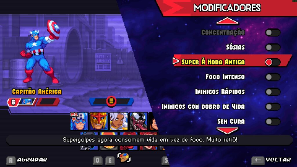 Já o modo Arcade segue uma linha mais direta, sem objetivos específicos. É o “puro beat’em up”, focado em combate e progressão rápida. Mas o diferencial está nos modificadores, que você libera na Matriz Cósmica e aplica livremente. Dá para deixar tudo mais difícil, mais clássico ou simplesmente mais caótico. Desde o ajuste que troca o custo do especial para o próprio HP, até opções que reforçam inimigos, mudam regras ou transformam a run inteira.