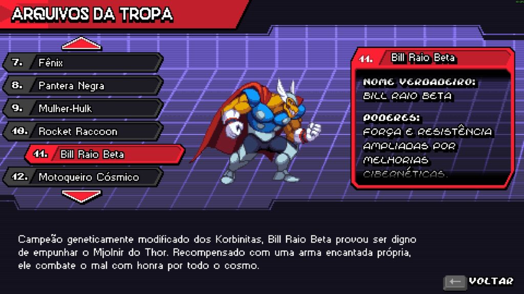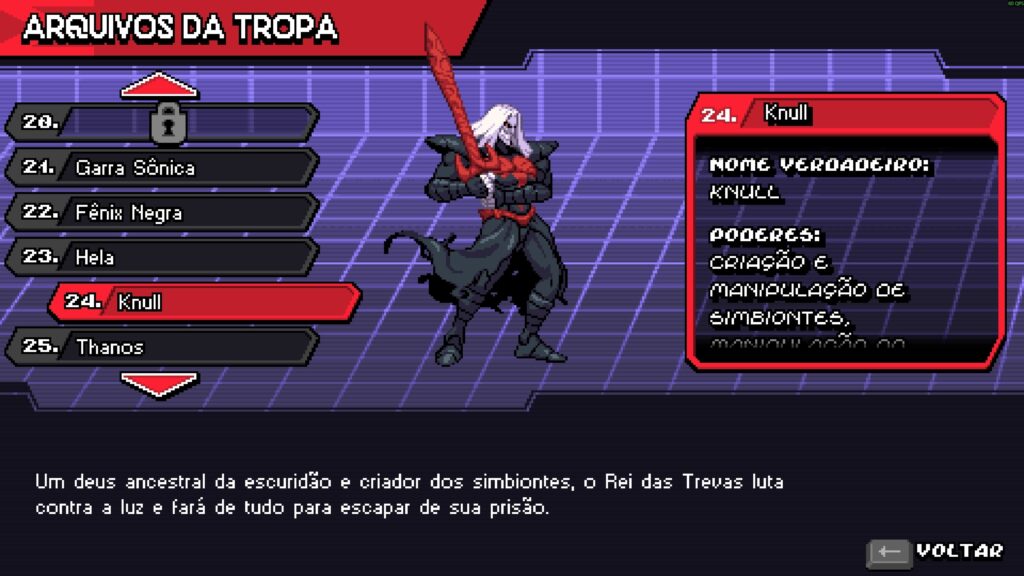 Esses pontos são usados na Matriz Cósmica, o grande hub de recompensas do jogo. Aqui você libera artes conceituais, faixas da trilha sonora, modificadores para o Arcade e, principalmente, os arquivos detalhando cada personagem e cada vilão. E esse último ponto é um dos mais legais, porque o jogo abraça o fato de que o universo Marvel é imenso — e mesmo quem lê quadrinhos há décadas sempre acaba esbarrando em alguém novo.