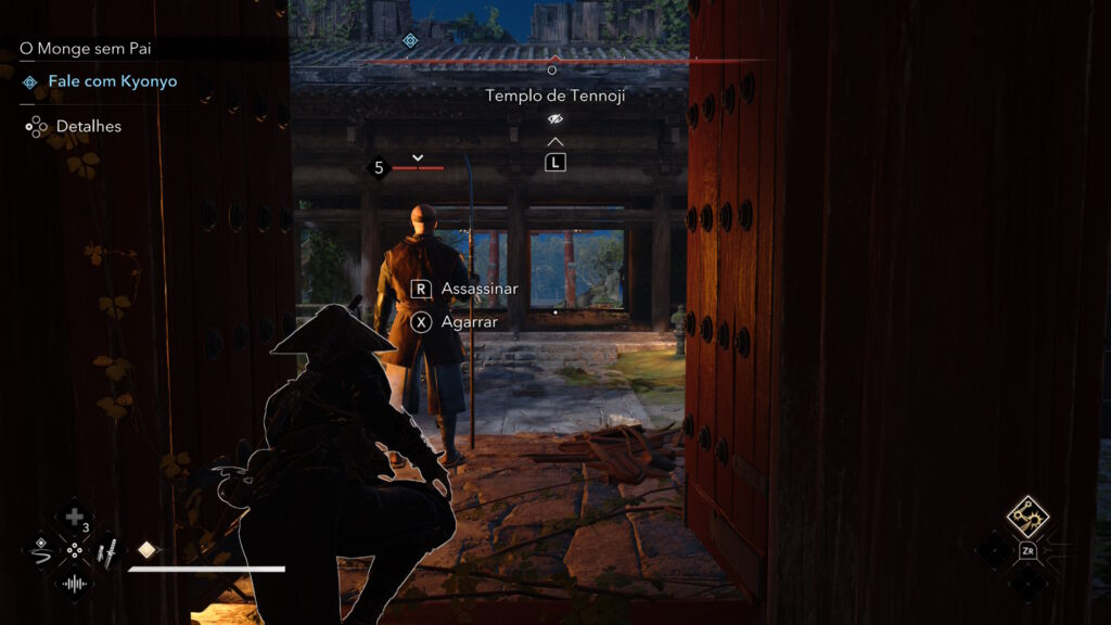 Com todos esses cortes, a expectativa natural é ter um frame rate realmente estável em troca. E aqui o resultado é misto. Assassin’s Creed Shadows mira nos 30 fps, e na maior parte do tempo atinge esse objetivo. No entanto, nas maiores cidades existem quedas perceptíveis e, principalmente, um problema de frame time que causa stutter ao girar a câmera ou correr muito rápido. A fluidez simplesmente não acompanha o movimento, e isso acontece com frequência no modo dock.