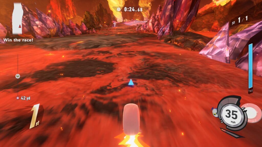 Pode parecer excessivamente simples no papel, e confesso que as primeiras partidas podem ser confusas para quem está acostumado a segurar um gatilho para correr. O jogo exige que você reaprenda a pilotar. No entanto, é nessa simplicidade que reside uma profundidade surpreendente. Dominar o timing dos boosts, saber quando planar e como aterrissar perfeitamente para ganhar velocidade extra cria um teto de habilidade alto. Além disso, cada um dos 21 personagens disponíveis possui uma habilidade especial única, adicionando uma camada estratégica que vai além de simplesmente escolher a nave mais rápida.