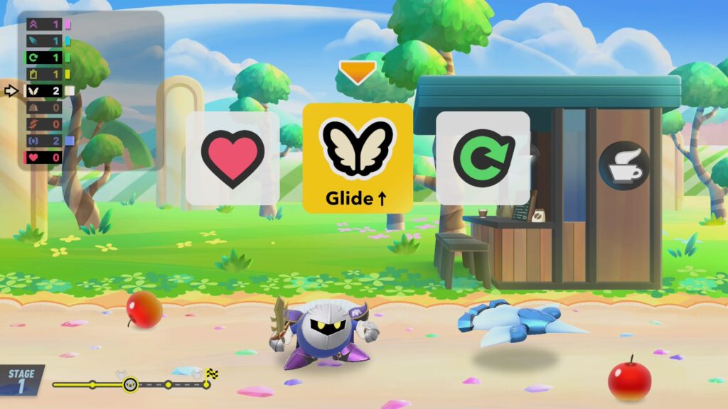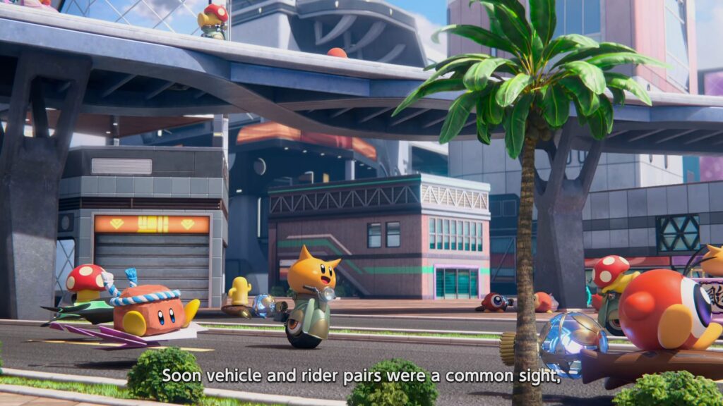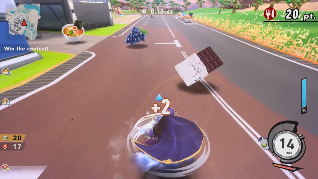 Por outro lado, o modo City Trial, ou Prova Urbana, retorna como o verdadeira núcleo do jogo. Para quem não conhece, é uma espécie de modo sandbox onde os jogadores têm cinco minutos em uma cidade aberta (agora expandida e chamada Skyah) para coletar adesivos que melhoram os atributos da nave, como velocidade, peso e planar. É uma corrida contra o tempo e contra os rivais, com eventos aleatórios que incluem a aparição de chefes como Dyna Blade e Kracko. Ao final do tempo, todos são levados para um minigame decisivo, que pode ser uma corrida de arrancada, uma batalha ou um concurso de planar. É viciante, caótico e, sem dúvida, onde você passará a maior parte do tempo, especialmente no modo online que se mostrou muito estável em nossos testes.