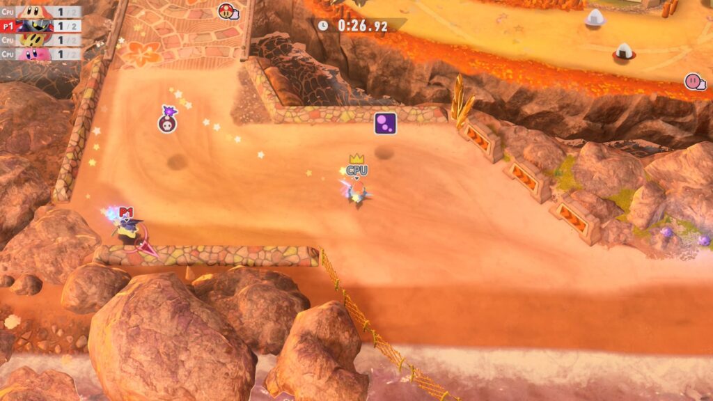 Outra adição muito bem-vinda é o retorno do Top Ride (Vista aérea). Este modo apresenta corridas com uma câmera isométrica (vista de cima), lembrando clássicos como Rock’n Roll Racing ou Biker Mice from Mars de Snes. São pistas menores, com controles que podem ser alternados para um estilo mais clássico, oferecendo uma diversão mais “arcade” e direta. É o tipo de modo perfeito para partidas rápidas com amigos no sofá, trazendo uma sensação nostálgica de brincar com carrinhos de controle remoto, mas com todo o polimento visual que o Switch 2 consegue entregar em Kirby Air Riders.