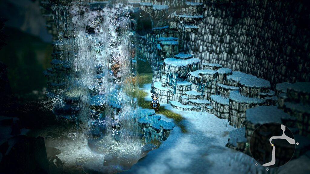 A direção de arte continua sendo o carro-chefe. O estilo HD-2D brilha intensamente, misturando pixel art nostálgica com efeitos de iluminação modernos. Os biomas são variados e deslumbrantes, indo de cavernas escuras a florestas vibrantes e picos nevados.